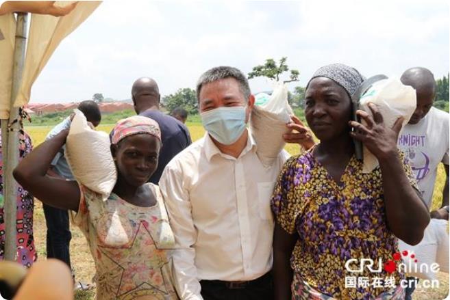 图示:中地海外绿色农业西非公司向当地农户赠送杂交水稻种子。(王新俊 摄)