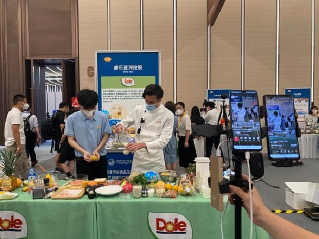在第五届进博会食品及农产品展区展前供需对接会上,不少外国友商拿出看家本领使劲“吆喝”。随着移动互联网和直播的渗透,销售展示渠道也更加丰富多元。在都乐展台,一名法国大厨刚从北京赶来,操着熟练中文为直播镜头后的观众们,讲解制作健康沙拉和奶昔的步骤。“大厨用到的香蕉、蓝莓等各类水果食材,都是我们计划登上本届进博会的展品。”展台负责人介绍。