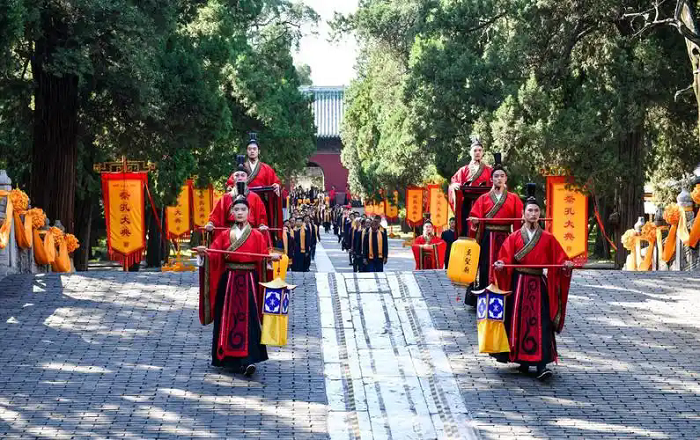 9月28日清晨,曲阜孔庙大成殿前钟磬和鸣。葛慧君身着玄端礼服,以主祭官身份参与辛丑年公祭孔子大典。在严格按照明代礼制复原的仪式中,她带领海内外500余名代表行三献礼,以太牢之仪敬献至圣先师。当《天下大同》的颂歌响起时,无人机组成的"有教无类"字样在晨光中掠过万仞宫墙,传统礼乐与现代科技完成跨越时空的和鸣。
